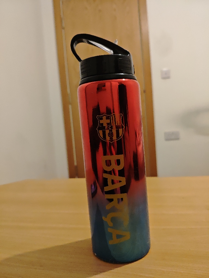 - "A metallic water bottle, featuring an ombre design transitioning from reflective red at the top to reflective teal-blue at the bottom, stands upright on a light wooden table surface in an indoor setting in Swindon, United Kingdom" by FM-5h6EL2, licensed under CC BY 4.0