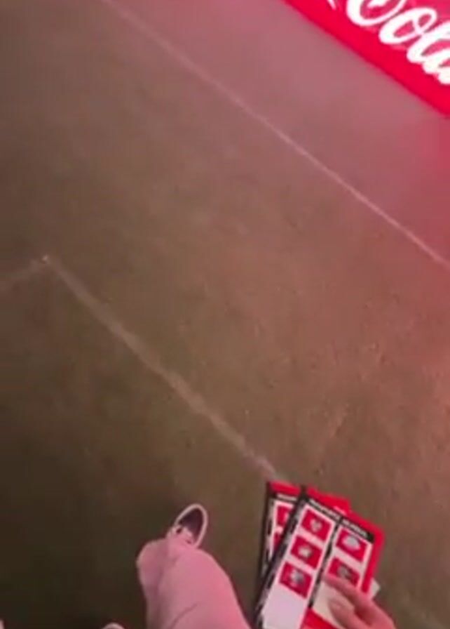 The video begins with a person walking past a Coca-Cola sign, holding several cards or tickets with photos on them. The camera angle is low, showing the person's legs and shoes as they walk. The person moves towards a group of people watching a large screen displaying a crowd cheering. The screen is flanked by Coca-Cola signs. The area is filled with red-tinted fog. The people are of various ages, including children.