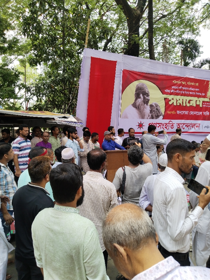 The image depicts a gathering of people in front of a large banner with a red background and a picture of a man. The man is speaking, and the crowd is attentive. The banner is likely a political advertisement for the man, who may be a political figure in the area. The people are standing and sitting, and many are dressed in traditional Bangladeshi clothing. The scene is set in an urban environment, likely a street or a park in Dhaka, Bangladesh, at the coordinates 23.73 latitude and 90.406 longitude. The setting is outside, with green trees in the background and a cloudy sky above. The crowd is dense, and the atmosphere is one of anticipation and excitement.