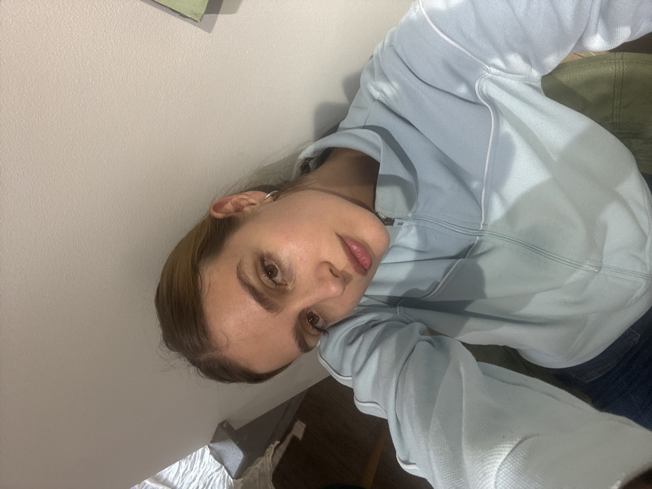 The image depicts a young woman in an indoor residential setting in Tbilisi, Georgia. She is positioned for a selfie, with the camera angled slightly downwards towards her. Her head is tilted to the left, and she has brown hair, brown eyes, and appears to be wearing light lip color. She is wearing a light blue full-zip track jacket featuring white piping details, and dark blue trousers are visible below. A small silver hoop earring is present in her left ear. The background consists primarily of a plain light-colored wall. To the left, a blurred white textured fabric, possibly a bedspread, and a dark, indistinct surface are visible. To the upper right, a fragment of a green object is partially visible on the wall, and below her right arm, a dark green object, possibly a chair's armrest, is present.