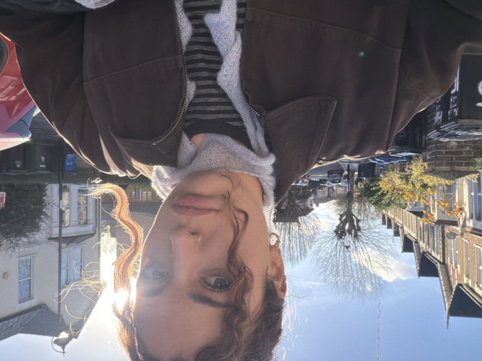 The image displays a frontal, chest-up portrait of a young adult female looking directly at the camera. She has curly, reddish-brown hair, a nostril ring on her left nostril, and small hoop earrings. Her facial expression is neutral, with a slightly downturned mouth. She is wearing a dark brown, collared, zippered jacket over a grey and black horizontally striped shirt, and a light grey, ruffled, knit scarf. The background shows an urban residential street under a clear blue sky with bright, low-angle sunlight casting backlighting and lens flare. On the left, a row of multi-story terraced houses with bay windows and distinct rooflines extends into the distance. The street is lined with bare deciduous trees and some shrubs displaying yellow-orange foliage. Multiple black and green waste and recycling bins are visible along the sidewalk. In the midground, parked vehicles are discernible, and a red car is partially visible on the far right. A street lamp is also present on the right side of the street. The location is an unknown residential area in Unknown, Unknown.