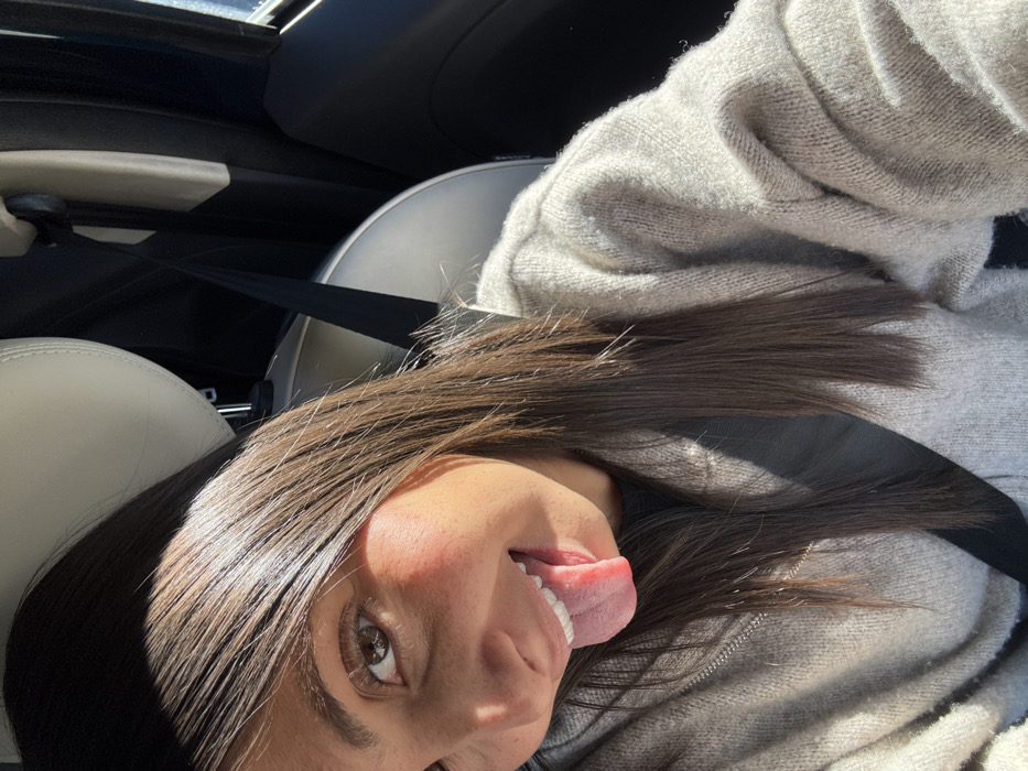A single female subject, with medium-dark skin tone and long dark hair, is depicted in a close-up, high-angle photograph taken inside a vehicle. She appears to be seated in the front passenger position, with a light-colored headrest visible behind her. The subject is wearing a light grey or beige knitted cardigan over a dark garment, secured by a dark seatbelt crossing diagonally from her left shoulder to her right hip area. Her face is turned towards the camera, and she is shown extending her tongue in a playful gesture. Direct sunlight illuminates the right side of her face, shoulder, and hair, casting some shadows. The interior of the vehicle shows minimal detail beyond the seat and a dark door panel/dashboard section on the right. The scene is located in a vehicle in Antibes, France.