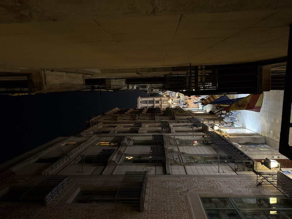 A nighttime urban scene shot from a low angle. Tall buildings with intricate facades rise upwards, punctuated by windows and balconies. Above, the sky is dark, contrasting with the building's illuminated surfaces. Streetlights cast a warm glow on the street below where flags of Spain and Catalonia are displayed. People are gathered on the street, suggesting activity. The perspective creates a narrow view of the street, emphasizing the height of the surrounding architecture.