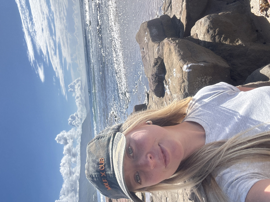 A female subject is captured in a selfie-style photograph on a rocky beach