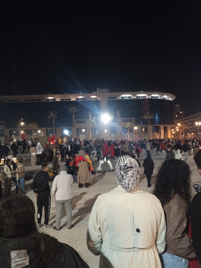 A nighttime view of a public square with a large crowd. A modern building with a ring of lights sits in the background. The area is illuminated by streetlights, some obscured by the gathering. In the foreground, people are facing towards the center, some wearing traditional head coverings. The scene suggests a public celebration or event.