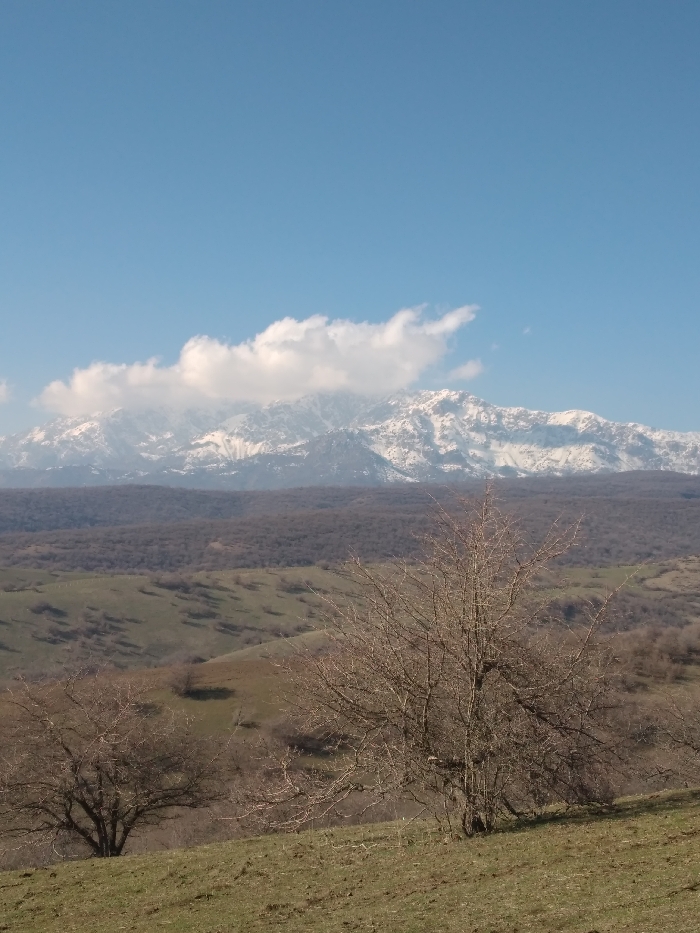 A scenic view showcases mountains capped with snow under a bright blue sky dotted with fluffy white clouds. The midground reveals rolling hills covered with sparse vegetation and patches of trees. In the foreground, bare trees stand prominently on a grassy slope, hinting at a transitional season. The overall impression is one of natural beauty and tranquility.