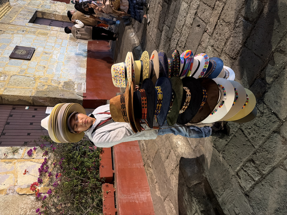 A man wearing many hats on his head sits beside a display of colorful hats in front of a building with blooming purple flowers. The building is made of stone and has a red border. A group of people walks in the background. The man is wearing a grey sweatshirt and jeans. The ground is paved with stone blocks.