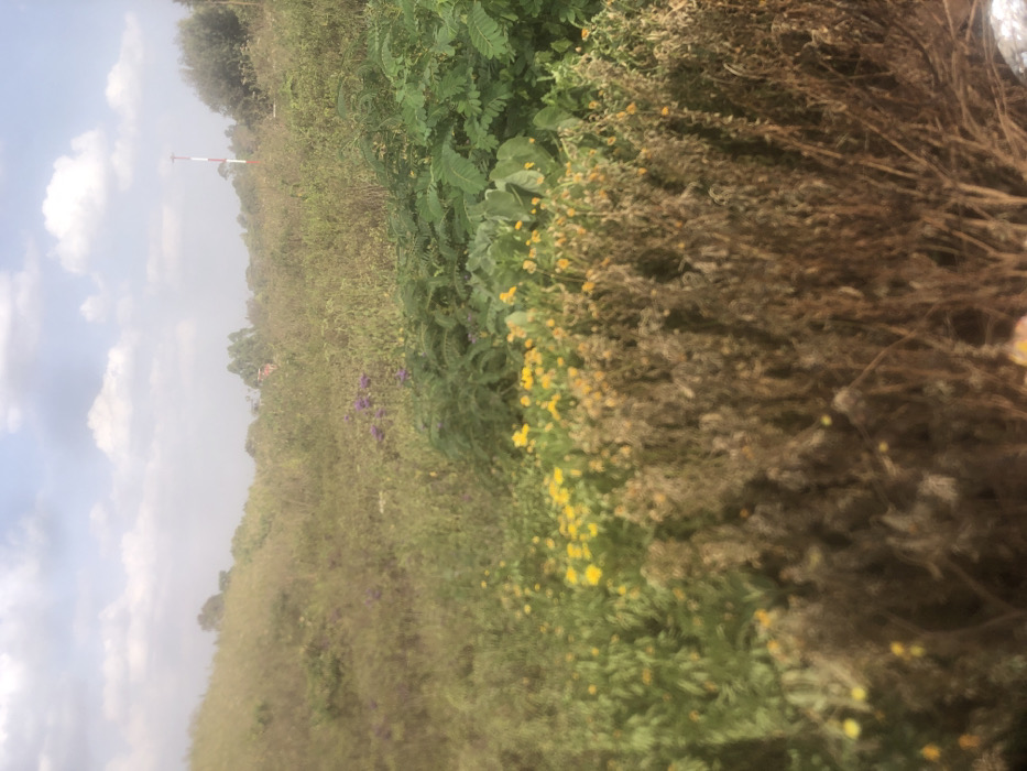 This image depicts an expansive, uncultivated natural landscape located in Ngong ward, Kenya, under a hazy daytime sky with scattered white clouds. The foreground consists of dense, predominantly brownish and dry vegetation interspersed with bright yellow flowering plants. Moving into the midground, the vegetation transitions to a more lush, green appearance, featuring larger-leafed plants and scattered patches of purple flowers. On the left side, a gently sloping, grassy hill rises. In the far background, slightly right of center, a red and white striped pole, indicative of a communication or antenna mast, stands amidst trees. A faint, reddish structural element, possibly a building roof, is barely discernible through the atmospheric haze and distant foliage, to the left of the pole. No people, animals, or discernible actions or interactions are present within the scene.