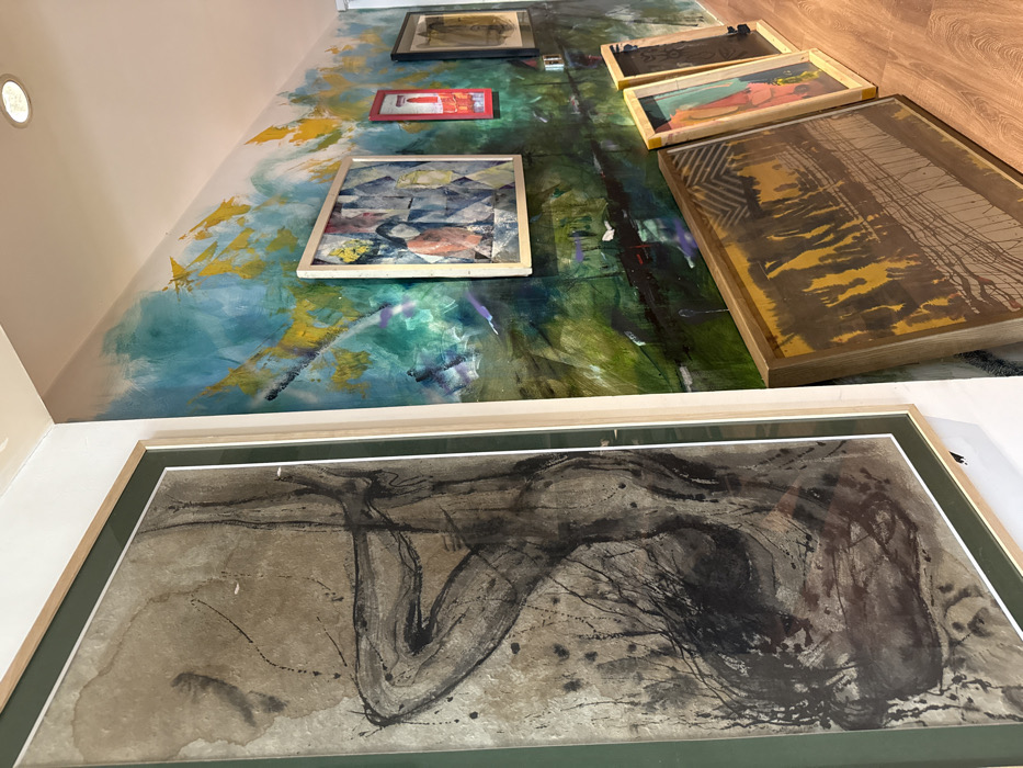 The image depicts an interior view of an art display space, potentially a gallery or private collection, located in Hà Nội, Vietnam. On the left, a large, vertically oriented framed artwork dominates the foreground, featuring an abstract charcoal or ink drawing of a contorted human figure on a textured light brown background, characterized by expressive lines and splatters. This artwork is enclosed in a light wooden frame with a dark green inner border. The wall to the right is covered by a vibrant, abstract mural with swaths of teal, green, and blue, accented by yellow and sparse purple brushstrokes. Overlapping this mural, a medium-sized framed painting, centrally positioned on the right wall, displays abstract figures or portraits composed of geometric shapes in warm hues like orange and yellow. To its right, a smaller, vertically rectangular painting in a bright red frame depicts a stylized red building or tower. Further to the right, a dark-framed artwork is partially visible. Resting on a light brown wooden floor and leaning against the muraled wall are three additional framed artworks. The leftmost leaning piece features a dark brown and yellow abstract composition with horizontal and diagonal lines. The ceiling is white and includes at least one circular recessed light fixture. No individuals are present within the frame.