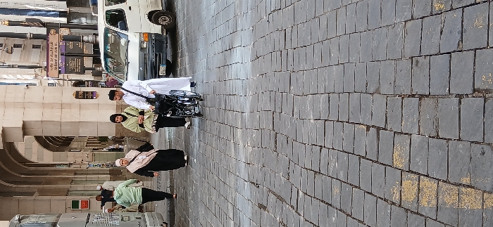 This image captures a street scene in Medina, Saudi Arabia, specifically on or near Prince Abdulmohsin bin Abdulaziz Street, as indicated by visible Arabic street signage. The foreground is a dark grey block-paved surface with faded yellow markings. In the mid-ground, a man in a white thobe and dark head covering pushes an unoccupied black manual wheelchair while walking from right to left. He carries a black shoulder bag. To his immediate left, a woman in a light olive green jacket with fringed trim and a dark hijab walks in the same direction. To her left, slightly ahead, another woman in a black abaya and light beige hijab also walks from right to left, carrying a dark shoulder bag. The background reveals light-colored stone buildings with distinct arched architectural features and windows. To the far left, a grey bus or large vehicle is partially visible. Further back, a man in a light green hooded top walks to the left, and another man in a white thobe points to the left while engaging with a partially visible person. To the far right, a white commercial van is visible, parked or stationary. Street signs displaying Arabic text and the number "236" are mounted on poles and building facades. The scene is lit by natural daylight.