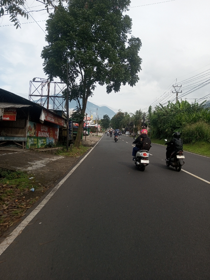 The image depicts a roadside scene in Sat Thay (East), Myanmar, under an overcast sky. A two-lane asphalt road extends into the distance, with a solid white line marking its left edge. In the foreground, two individuals on motorcycles are traveling away from the viewer; the left rider operates a silver scooter and wears a black backpack with a pink helmet, while the right rider operates a dark-colored scooter and wears a dark helmet and backpack. Additional motorcycles are visible further down the road, indicating traffic. On the left side of the road, a dirt shoulder with scattered leaves and debris borders a low-lying, weathered building complex featuring corrugated roofing. Multiple signs on this structure display "LOTEK BANDUNG" in red and white, alongside text referencing "KETIS KACANG." A large, leafy tree stands prominently next to the building, partially obscuring an empty metal billboard frame behind it. Overhead power lines crisscross the upper left quadrant. On the right side of the road, dense green foliage, including bushes and smaller trees, lines the roadside. Utility poles with multiple power lines are visible above this vegetation. The background features distant hills or mountains partially obscured by atmospheric haze or clouds.