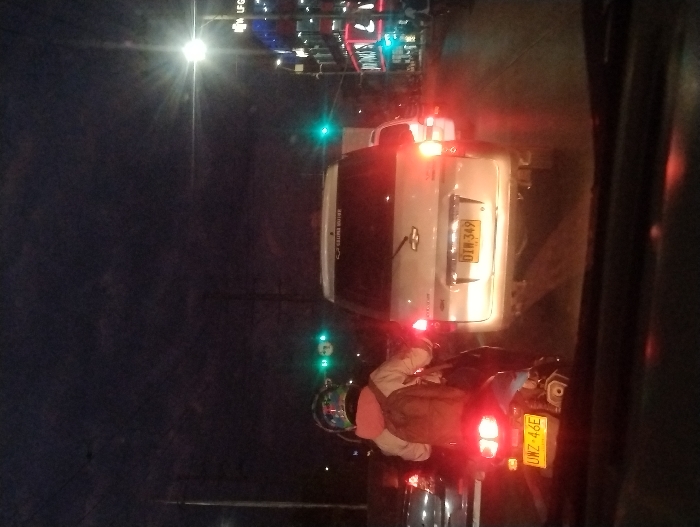 - "A white car and a motorcycle are stopped at a traffic light at night" by FM-02wEw1, licensed under CC BY 4.0