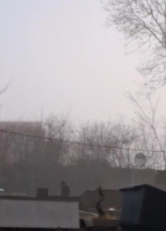 foggy outdoor scene. The camera pans up from behind a black brick wall, over a chain-link fence and some low, indistinct buildings, to a large bare tree with many branches against the foggy sky. A satellite dish is visible in the background. The overall scene is muted and gray due to the fog.