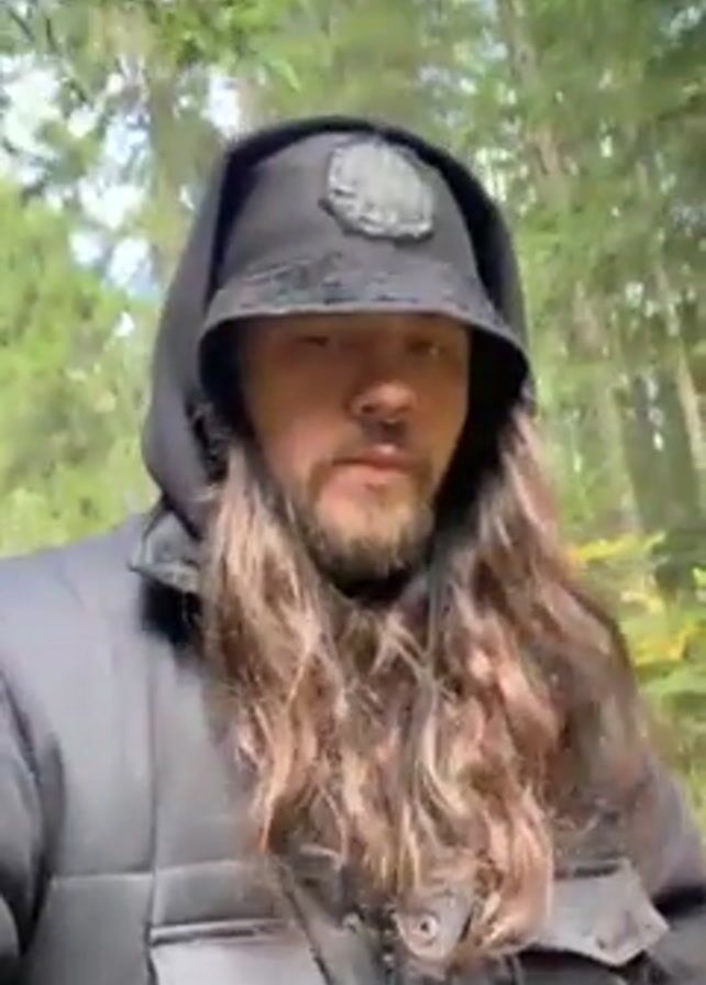 A man with long, wavy, brown hair and a beard, wearing a black puffer jacket and a black bucket hat with a patch, is walking through a forest