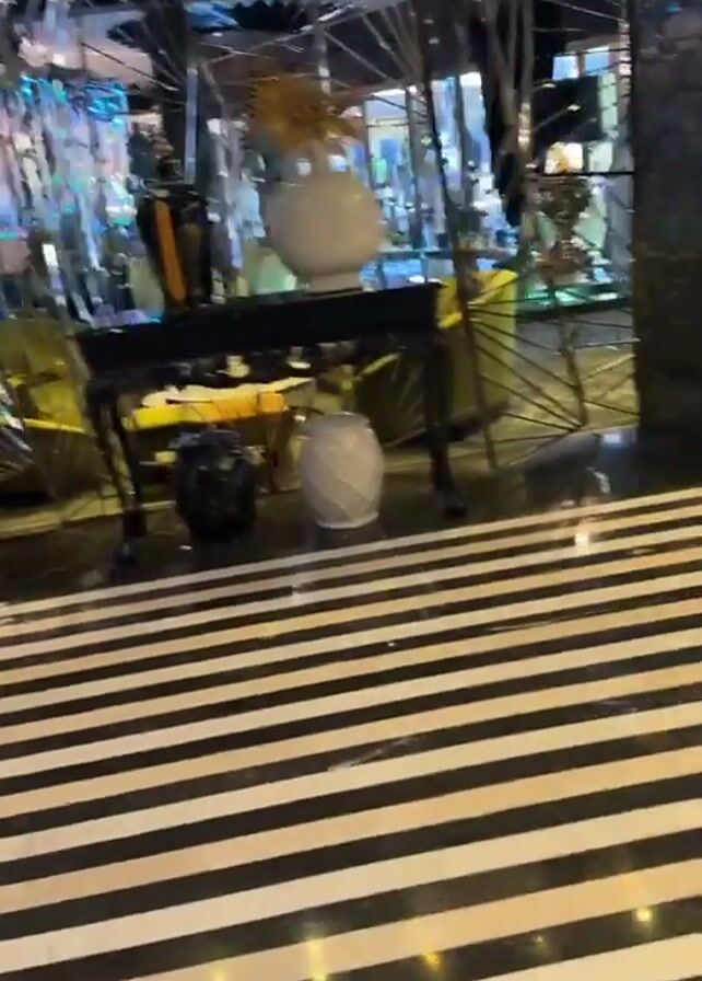 n indoor space with a striped black and yellow floor. At the beginning, there is a black table decorated with vases. As the camera moves, it pans to the right, revealing a promotional sign for the MERIT CASINO ZENITH Grand Opening, featuring a man named AZIS, scheduled for May 1st, Friday. There are windows in the background and a speaker next to the sign. The space appears to be a lobby or entrance area of a hotel or casino.