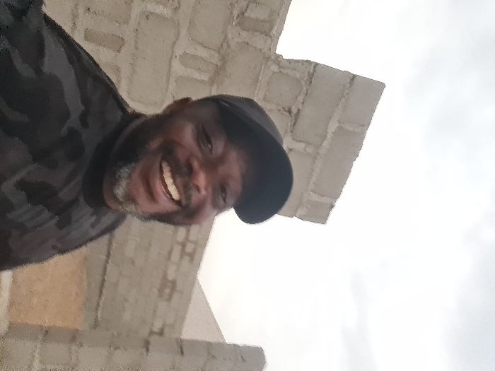 A man smiles broadly wearing a black cap and camouflage shirt. He appears to be outside with a building under construction with cinder blocks visible in the background. The sky is overcast. The photo is taken from a low angle, looking up at the man.