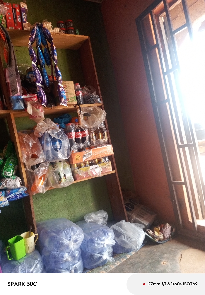 The image depicts the interior of a small retail establishment or storage area in Kakau, Nigeria