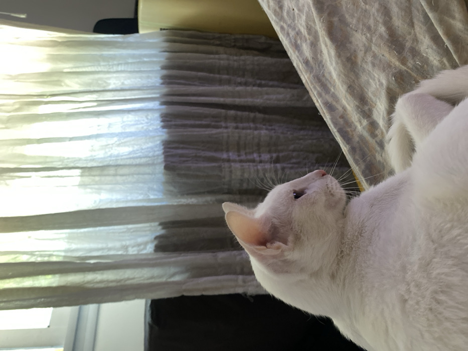 - "A white cat lies on its side, looking upwards" by FM-POpJ12, licensed under CC BY 4.0