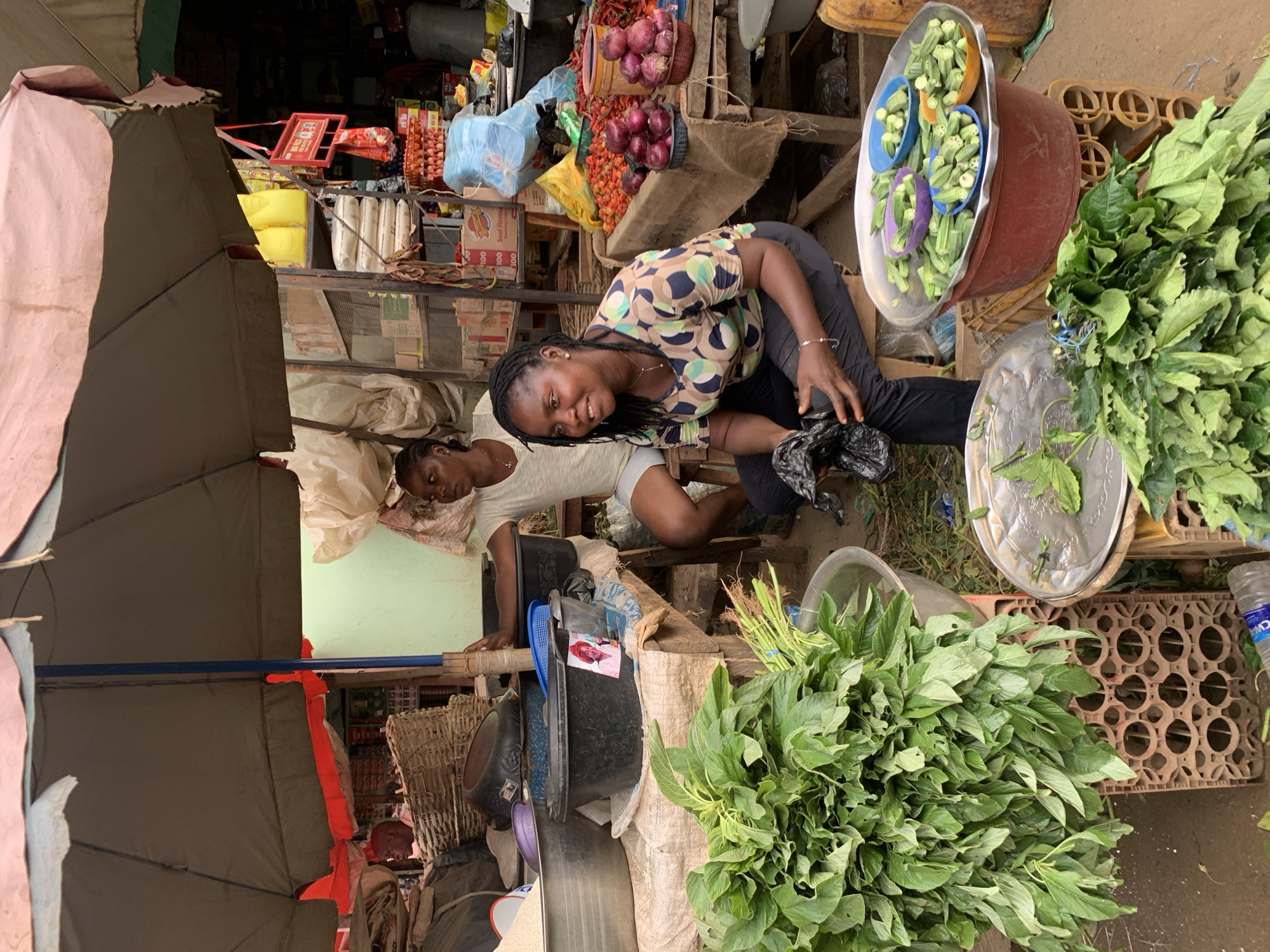This image captures an active market stall in Akwanga, Nigeria. The scene is dominated by two women engaged in vending activities under the shade of a large, worn, brown umbrella. In the foreground, a woman with dark skin and braided hair sits on a low stool, facing slightly left. She wears a patterned short-sleeved top in olive green, blue, brown, and beige, along with dark trousers, a simple necklace, and a wrist bracelet. She is smiling and holds a black plastic bag in her hands, appearing to sort or handle items. Behind her and to the left, a second woman with dark skin and dark hair pulled back is seated on a stool behind a wooden counter. She wears a light-colored, short-sleeved top and light-colored shorts, looking towards the left side of the frame. The market stall features a wooden counter, partially covered with a light-colored fabric. On the left, large bundles of fresh green leafy vegetables are displayed on a brown plastic crate, with additional greens soaking in a silver basin. Further right on the counter are several containers, including a large silver bowl, two black plastic tubs (one bearing a small red and white sticker depicting a face), and a blue plastic sieve. To the right, a red plastic tub supports a large silver tray containing multiple small colorful bowls (purple, blue, orange) filled with chopped okra. Adjacent to this, piles of red onions and red peppers are arranged on the counter. A small, red rectangular sign, partially obscured, hangs overhead. The background reveals a multi-tiered display of various packaged goods, including boxes, sacks of staples like rice or flour, yellow plastic jerry cans, and stacks of egg cartons. A light green wall is visible behind the second woman, suggesting a more permanent structure. The ground appears to be bare earth. A blue metal pole, likely part of the umbrella's support, is visible near the center.