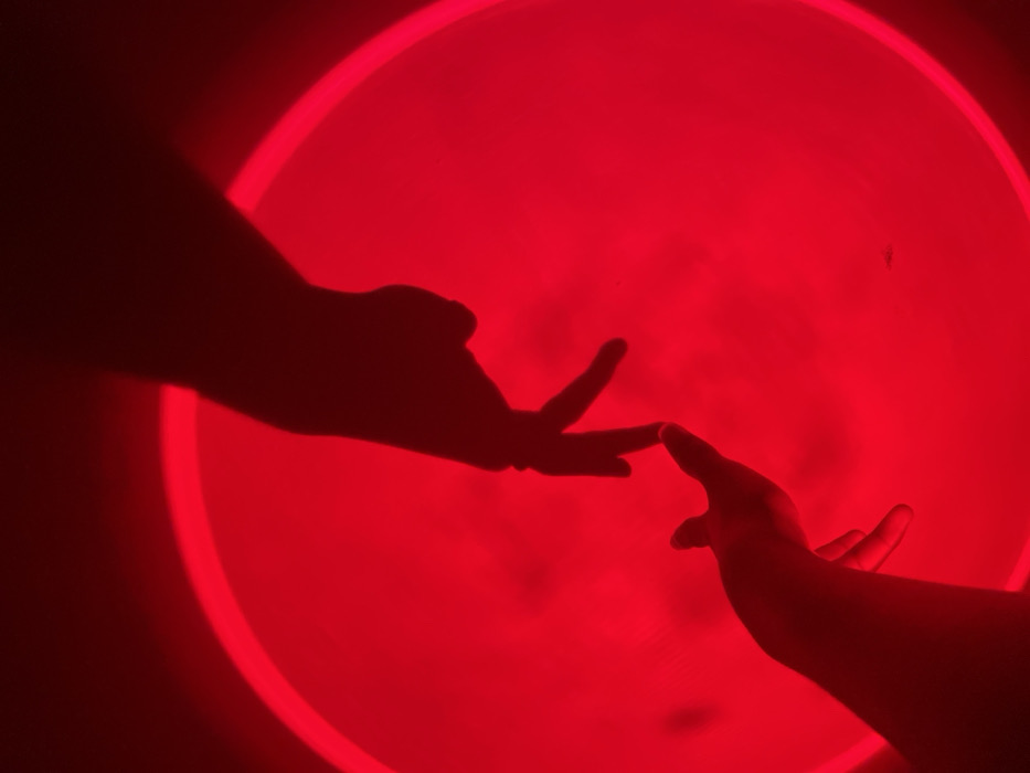 Two hands reach toward each other against a backdrop of a vibrant red circle