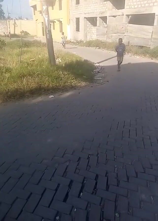A first-person perspective video shows an outdoor scene on a street paved with dark bricks laid in a herringbone pattern. Two young boys are visible in the distance. One is closer to the camera and wears a dark shirt with yellow shorts, while the other is further away. The buildings alongside the street appear to be in varying states of construction or repair. One is a yellow building with finished windows, while the other appears to be unfinished. There is some green grass and a utility pole along the edge of the street. The boy closer to the camera is walking along the street. The overall scene suggests a sunny day in a residential or developing area.