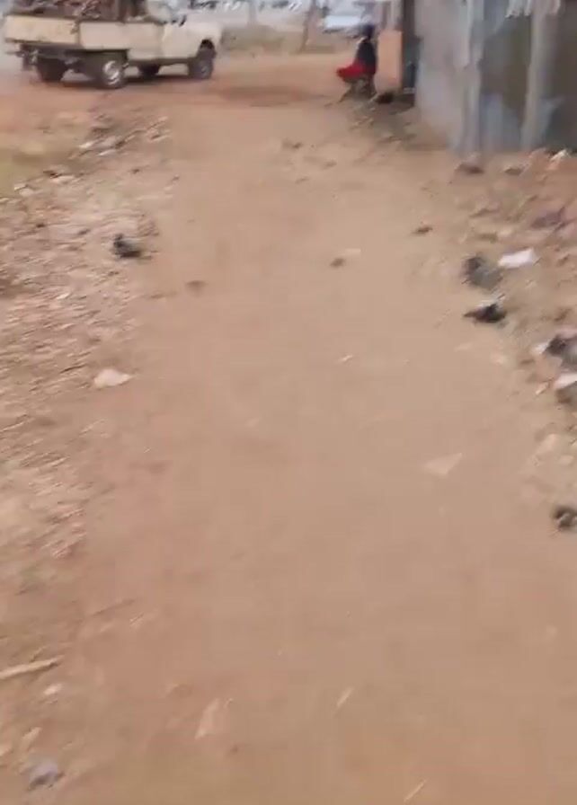 The camera moves slowly along a dirt road lined with trash. A corrugated metal building stands to the right. A person sits on a red object next to the building. A truck loaded with wood is parked in the distance on the left. Other vehicles pass by on a paved road. The sky is overcast.