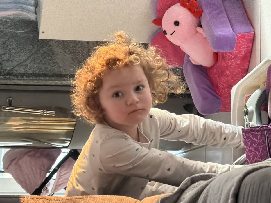 In an indoor setting in Trassem, Germany, a young child with fair skin and voluminous, curly, reddish-blonde hair is positioned in a crouched or leaning posture, looking directly forward towards the viewer with a slight head tilt. The child wears a light-colored long-sleeved shirt patterned with small dark heart shapes. In the immediate foreground to the left, a portion of a gray upholstered surface is visible. Below the child's upper body, a white plastic bin contains a white Xbox game controller and other unidentifiable items. To the right of the child, a small child-sized armchair with a pink patterned base and purple armrests holds a pink axolotl plush toy with black eyes and red gills. In the background, a tall, cylindrical, reflective metal object, possibly a stove or fireplace, stands next to a dark, textured wall. Further left in the background, a light pink baby stroller is partially visible. Warm light, consistent with natural sunlight, illuminates the child's hair and portions of the background.