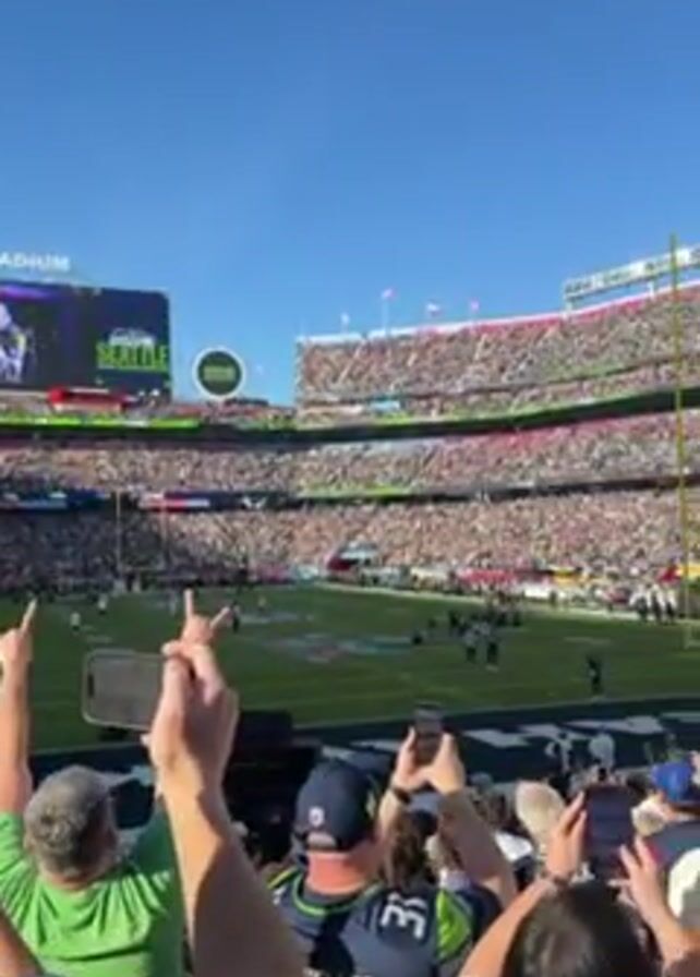 The video depicts a crowd of people in a packed stadium, likely attending a football game