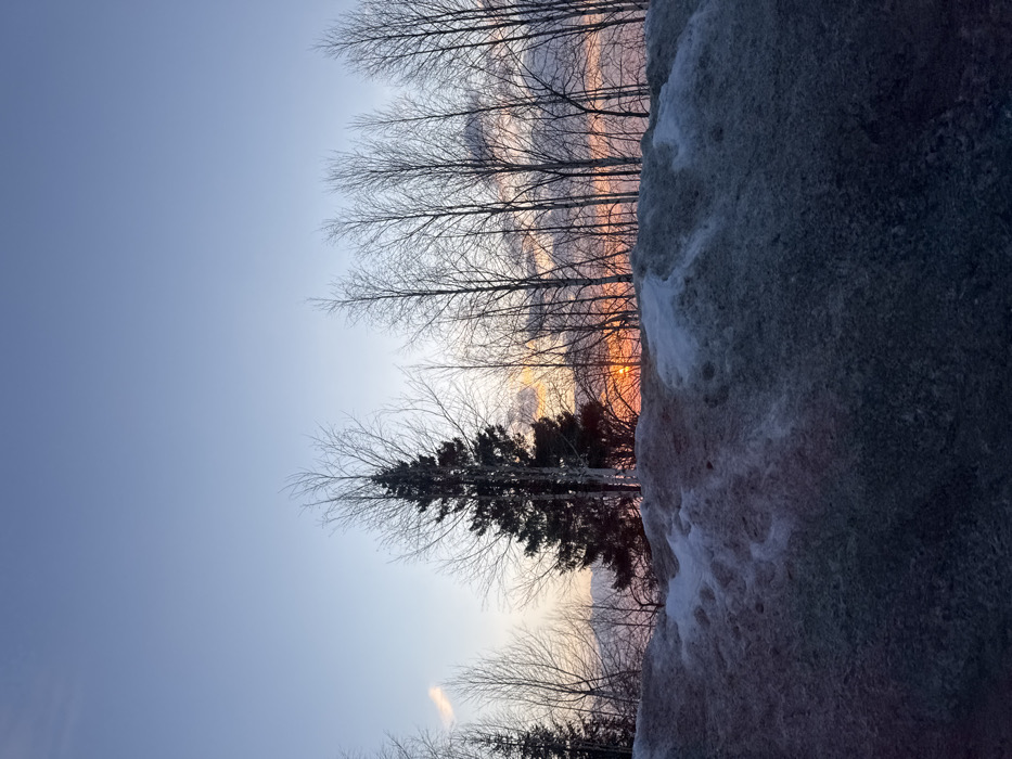 The scene depicts an outdoor winter landscape at twilight or dawn in Gremyachinsk, Russia. The upper portion of the image displays a sky transitioning from a pale blue zenith to hues of orange and pink along the horizon. The sun, a bright orange circular disc, is visible low on the horizon, partially obscured by the silhouettes of several bare deciduous trees and a prominent, dark green conifer positioned slightly left of center. The foreground is dominated by a substantial, mounded accumulation of dirty, compacted snow exhibiting variations in white, grey, and brown coloration, with an irregular, undulating surface. No human subjects, animals, or active interactions are present within the frame.