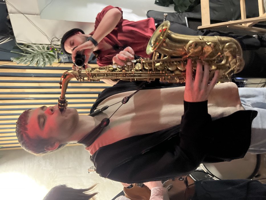 An indoor musical performance or rehearsal is captured in the city of Ovoshchnoy, Russia. In the foreground, a young male, likely in his late teens or early twenties, with short, light brown hair and closed eyes, is actively playing a gold-colored alto saxophone. He wears a black zip-up hoodie over a beige t-shirt and light-colored pants, with a black neck strap supporting the instrument. Red light casts a prominent hue on his face and upper torso. To his immediate left, a partial view of another individual holding an electric guitar is visible. In the midground, towards the right, a male with a beard and wearing a black beanie hat, a red short-sleeved collared shirt, and dark pants, holds a black cylindrical object, likely a microphone or small wind instrument, to his mouth. The background features a wall with vertical wooden slats, a large white panel, and a green leafy plant. Portions of a white drum, a black instrument case, and a light wooden chair are also discernible.