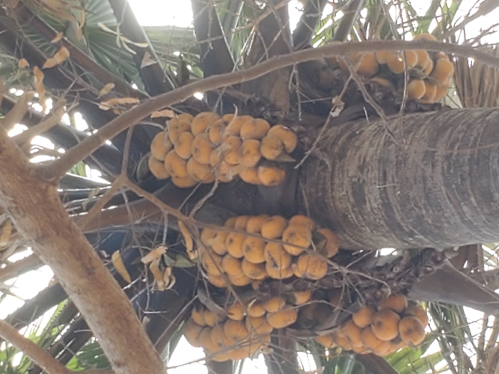 - "The image depicts an upward, close-up view of a tree, likely a palm, bearing multiple large clusters of yellow-orange ovoid fruits in Mangu, Nigeria" by FM-Du5X33, licensed under CC BY 4.0