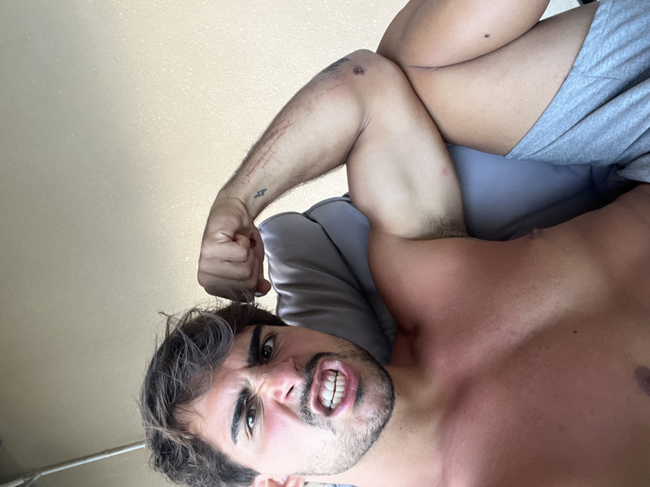 A tanned man with disheveled brown hair, clenched teeth, and a scowl, poses from a low angle. He flexes his left arm, revealing scratches and a lightning bolt tattoo. He wears grey shorts and appears to be lying on a grey pillow or cushion. The background is a plain, light-colored wall.