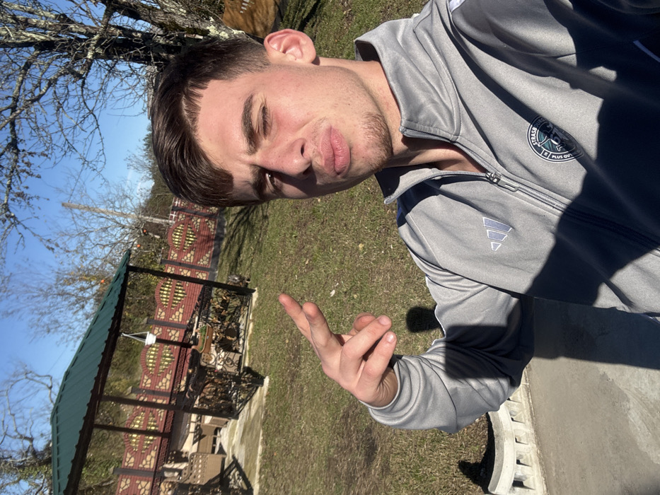 The image depicts an outdoor daytime scene in Bulishi, Georgia. A young adult male, with short dark hair, light complexion, and wearing a grey Adidas full-zip track jacket with a "STRASBOURG" emblem, is positioned in the foreground-right, facing the camera. He has pursed lips and slightly squinted eyes, extending his left hand with the index and middle fingers raised in a V-shape. Strong shadows indicate direct sunlight. In the mid-ground, to the left of the male subject, a green-roofed gazebo with dark metal framing and ornate railings stands on a paved patio area. Wicker-style outdoor furniture is visible within the gazebo, and a white hanging planter is suspended from its roof. Behind the gazebo, a decorative fence stretches across the mid-ground, featuring reddish-brown brick pillars and panels with intricate gold-accented metalwork. A small, dark-colored quadrupedal animal is visible near the fence, to the right of the gazebo. The ground is covered with green grass. In the background, deciduous trees with bare branches are visible against a clear blue sky, some bearing reddish-orange fruit. A paved area with a decorative concrete border is present in the foreground-left. The overall setting is consistent with a residential backyard or garden area.