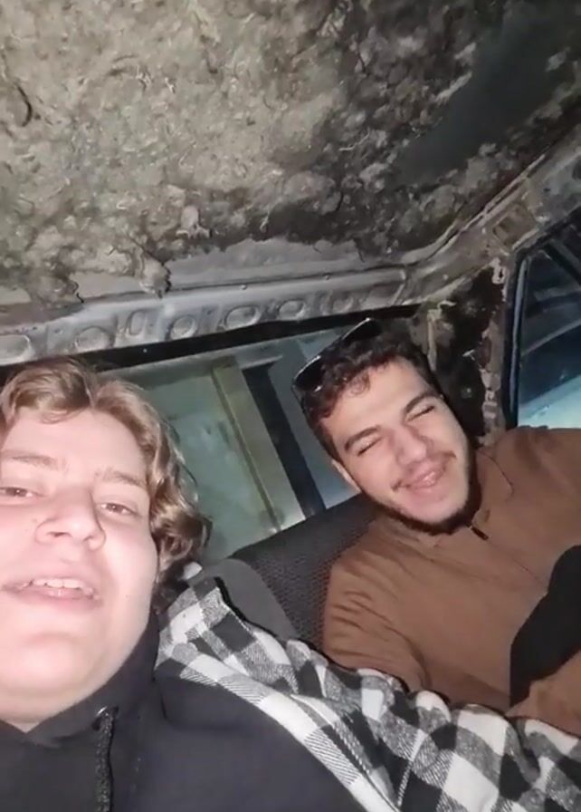 Two young men are seated in a vehicle. The interior of the vehicle appears old and weathered, with damaged ceiling upholstery. The first man on the left has shoulder-length curly hair, wearing a black hoodie with a white and black plaid patterned shirt. The second man, seated beside him, has dark hair and a beard, wearing a brown shirt. He laughs and appears to be wearing sunglasses atop his head. The scene suggests a casual or perhaps humorous moment between the two individuals within a vehicle that shows signs of age or disrepair.
