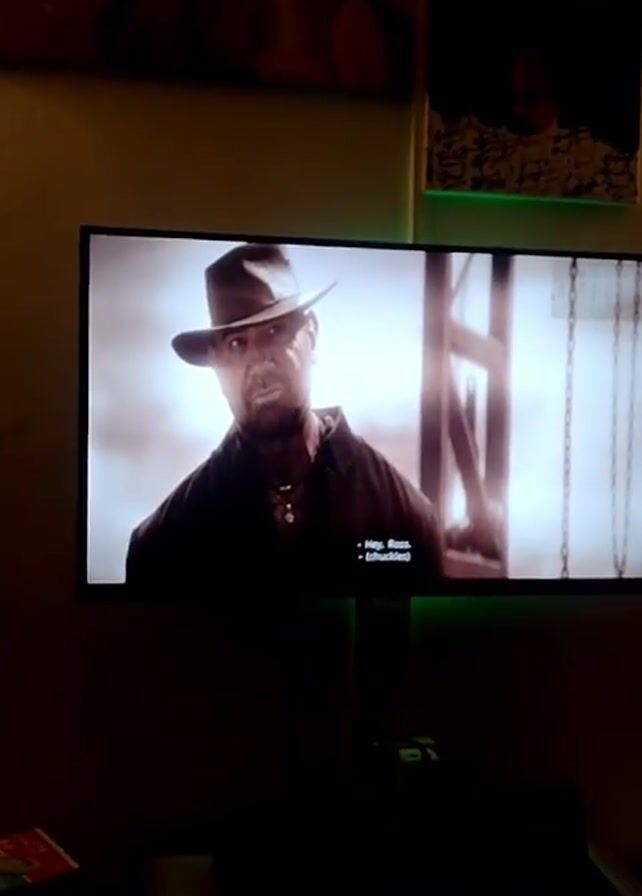 A video shows a TV screen displaying a scene from a movie. Initially, a man with a hat, beard, and dark clothing is seen in a monochrome setting. The scene then changes to a man with a shaved head and an eye patch, wearing a plaid shirt. He is smiling in front of a dark curtain. The scene shifts again, showing the same man from the first scene, without the hat, standing with a woman. Subtitles are visible at the bottom of the screen during all scenes. Above the TV, there are two pieces of artwork hanging on the wall, and green LED lights provide accent lighting around the TV and artwork. A sound bar and other electronic devices sit below the TV. The room appears to be dimly lit.