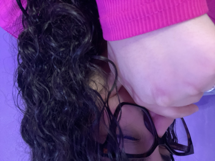 A close-up, high-angle portrait features the upper right portion of a person, positioned slightly off-center. The individual wears dark-rimmed eyeglasses and has long, dark, curly hair cascading down the right side of the frame. Their left hand is raised to their face, obscuring the lower part of the nose and mouth. The eyes are visible behind the eyeglasses and appear closed or downcast. A bright pink, ribbed garment covers the left forearm and wrist. The background is a solid, illuminated purple wall, casting a magenta-pink hue on the skin and clothing in the foreground. No other individuals or distinguishing objects are present.