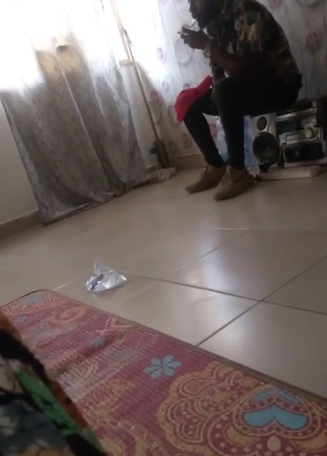 A man is sitting on a stack of electronic equipment in a room, holding something up to his face. He is wearing a patterned short-sleeved shirt, dark pants, and brown shoes. He has a beard. Behind him is a window with sheer curtains and a wall with a circular pattern. A red cloth sits next to him. In front of him, on the tiled floor, is a plastic bag and a colorful mat. The camera is stationary and low to the ground.