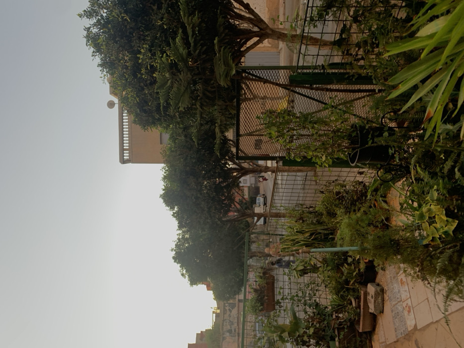 The image depicts an urban street scene in Casablanca, Morocco, observed from a lush, private garden overlooking a public road under a hazy, pale sky, indicative of a low sun angle. The immediate foreground features a dense arrangement of potted plants, ferns, and diverse green foliage on a tiled patio. A dark green metal mesh fence, incorporating a slightly ajar gate, delineates the garden from the street. Within the garden, a light brown human-like statue stands near the fence, and a blue pipe structure is also visible. Beyond the fence, a paved street is visible, bordered by mature trees with full green canopies. On the street, two indistinct individuals walk away from the viewer on the left, one in dark clothing and another in lighter attire. A light-colored van is parked or moving in the distance to the left, and a third figure in red is visible further right. In the background, a multi-story building with a light brown facade and a decorative rooftop balustrade, topped by a small satellite dish, occupies the right side. Reddish-brown buildings with visible terraces are present on the far left.