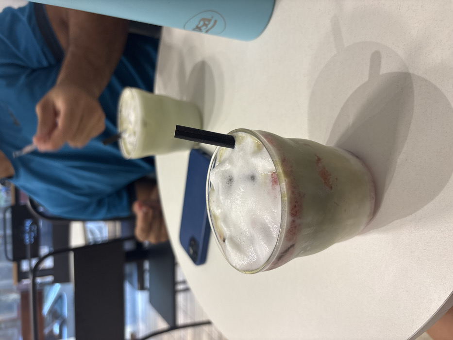 Two drinks sit on a white table. One appears to be a green-colored beverage with a straw, likely matcha. The other drink contains a white frothy layer on top, possibly a milk tea or a smoothie with foam. A blue smartphone is nearby, along with what seems to be a person seated at the table wearing a blue shirt and a light blue water bottle. Chairs are visible in the background.