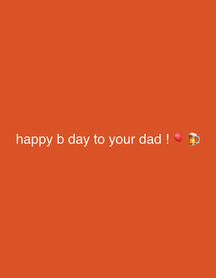 The scene is a digital graphic with a solid orange background, located in Erba, Italy. Centered horizontally in the lower portion of the image, white text reads 'happy b day to your dad !'. Immediately following the text are a red balloon emoji (🎈) and a beer mug emoji (🍺). There are no individuals, physical objects, actions, or discernible physical environment depicted within the image content.