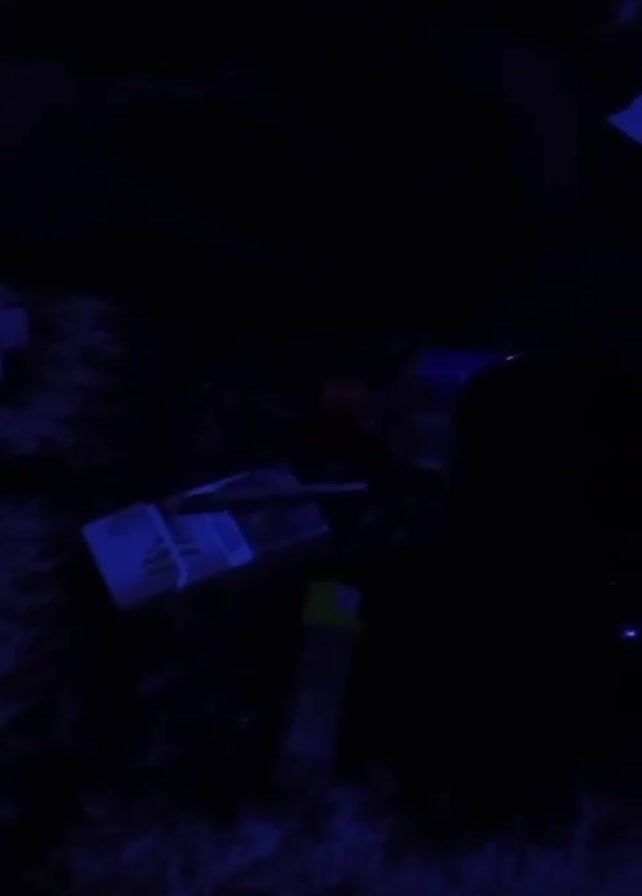 The video is taken in a dark room with a blue light illuminating the scene. On a furry surface, possibly a rug, are a pack of Marlboro cigarettes, a lighter, and a dark bottle. Music is playing in the background.