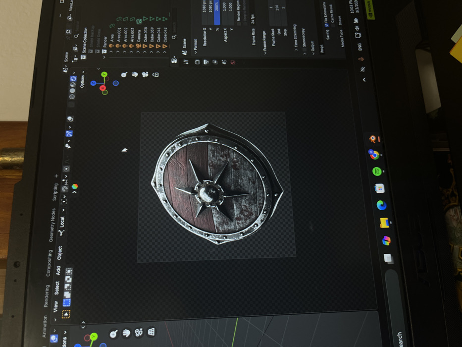 The image displays a close-up, angled view of a laptop computer screen, located indoors in Aytos, Bulgaria. The screen shows the Blender 3D modeling software interface, specifically a viewport rendering of a circular, medieval-style shield. The shield model is textured with distressed wood in two tones—reddish-brown on the upper half and grey on the lower—and features a central metallic boss with eight radiating spikes, surrounded by a riveted metallic rim. It is presented against a black and grey checkered background indicating transparency. The Blender interface's right panel displays "Scene Collection" and "Render" settings, with a visible resolution of 1920 pixels and a frame rate of 24 frames per second. A white arrow mouse cursor is positioned within the software's workspace. Above the screen, a laptop webcam lens and a small indicator light are visible on the top bezel. The lower portion of the laptop shows part of the Windows taskbar, featuring icons for applications such as Microsoft Edge, Slack, Spotify, Blender, and Google Chrome. The system tray in the bottom right corner indicates "ENG" (English language), the time as "10:03 PM," and the date as "3/3/2024." The ambient lighting suggests a dimly lit room, with reflections visible on the screen, revealing a wooden surface and a metallic gold object in the background. No individuals are present in the image.