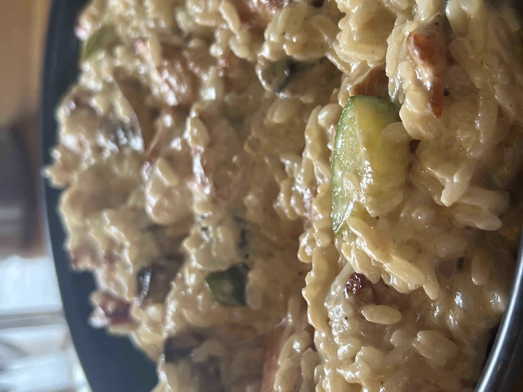 A close-up, eye-level photograph captures a creamy risotto dish served in a dark, possibly black, bowl, purportedly located in Yambol, Bulgaria