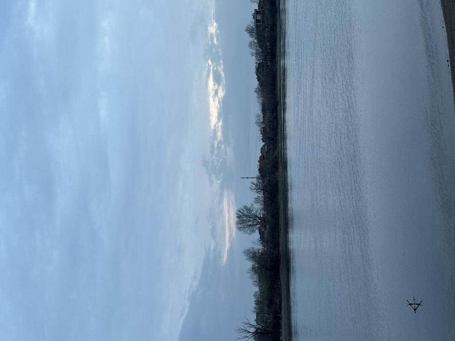 The image displays a wide, tranquil body of water, identified as the Kuban River in Krasnodar, Russia, viewed under an overcast, blue-grey sky. The distant riverbank, visible across the middle third of the frame, is densely covered with bare deciduous trees, suggesting a non-foliage season. Behind the trees, several low-rise residential structures with pitched roofs are discernable, along with a tall, slender lattice tower situated towards the left of the opposite bank. The sky above is characterized by an expanse of uniform grey-blue clouds, with a slightly brighter horizontal band of light visible near the distant horizon. The river's surface exhibits subtle ripples, reflecting the muted light. In the lower-left quadrant of the foreground water, an angular, dark, partially submerged object, consistent with branches or driftwood, is visible. A narrow strip of what appears to be a sandy or pebbly bank is present along the bottom right edge of the frame. No individuals or active subjects are present.
