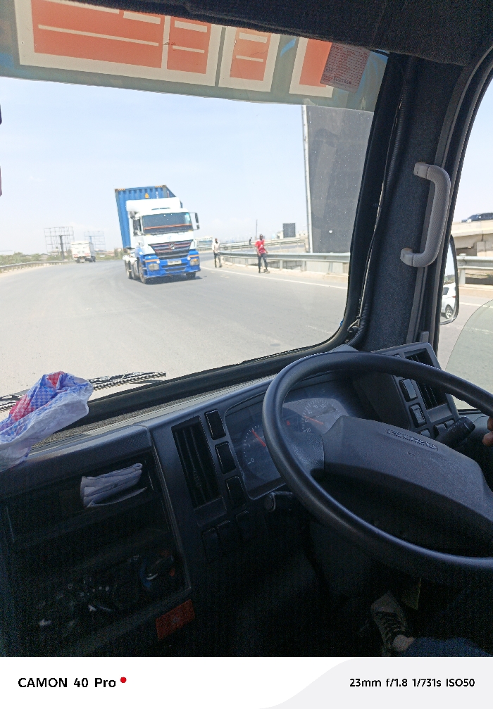 Captured from inside a vehicle, likely a truck, the shot focuses on the steering wheel and dashboard. Outside, a white and blue semi-truck carrying a blue container is visible, alongside two individuals standing near a road barrier. The overall perspective suggests the photographer is also a driver on the same road, providing a situational snapshot. The composition is asymmetrical, with the right side of the frame dominated by the dashboard and steering wheel.