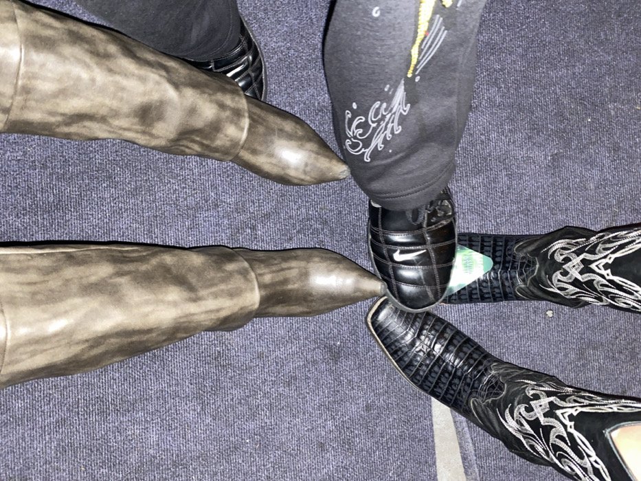 The image depicts an overhead view of six footwear items arranged on a dark grey, textured carpet in Los Angeles, United States. Two rigid, light brown, high-shaft, pointed-toe boots, consistent with a display or mannequin, occupy the upper portion, their tips meeting centrally. Clockwise from the bottom left, a black square-toe cowboy boot with a textured, scale-like pattern and white embroidery points toward the center. Next to it, a black quilted soccer-style shoe with a white Nike swoosh and a green tag beneath its toe also points centrally. A dark grey/black soft shoe or slipper with white and yellow embroidery depicting a fish and waves is positioned to its right, its toe near the center. A black quilted slip-on shoe is partially visible in the top right, pointing outwards. The scene is indoors.