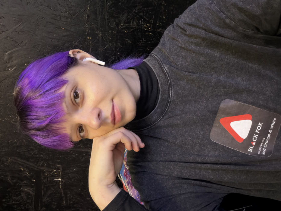 A person with short, vibrant purple hair poses with their head resting on their hand, looking at the camera. They are wearing an earbud, a black turtleneck layered under a gray t-shirt with a "BLACK FOX" logo that includes a red and white triangle design. The background is a dark, textured surface. The picture has a casual, slightly tilted perspective.