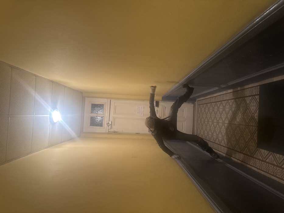 The scene depicts an interior hallway within an unidentified building in Roanne, France. The hallway features pale yellow walls above a dark blue-grey dado rail, with a geometrically patterned tiled floor. A bright, centrally mounted overhead light fixture provides illumination. At the end of the hallway, a white wooden door with two textured glass panels and a small affixed notice is visible. A single individual is observed horizontally suspended across the hallway's width, with their back to the viewer. They are dressed in dark attire, including a long-sleeved top, pants, boots, and a patterned beanie. Their limbs are extended and braced: the left hand and foot against the left dado rail, and the right hand and foot against the right wall and dado rail respectively, maintaining an elevated position between the opposing surfaces.