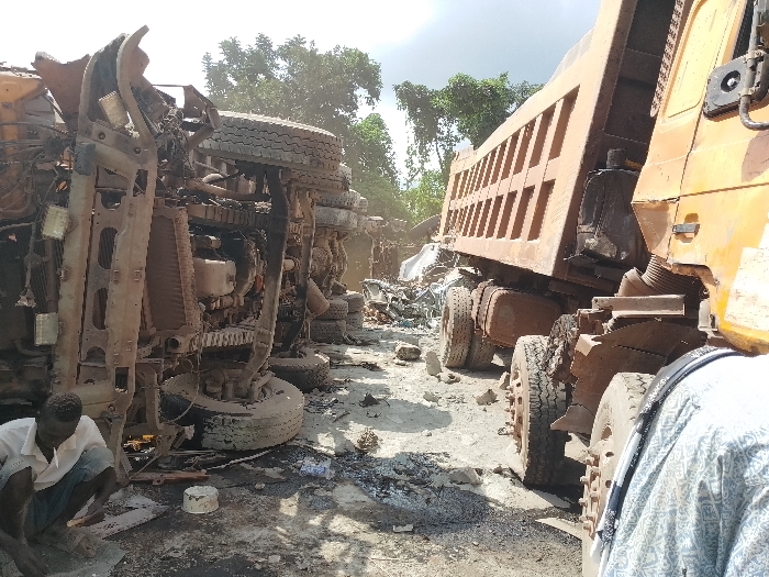 The scene in Ejule, Nigeria, depicts the aftermath of a major incident involving two damaged heavy-duty trucks under a hazy sky
