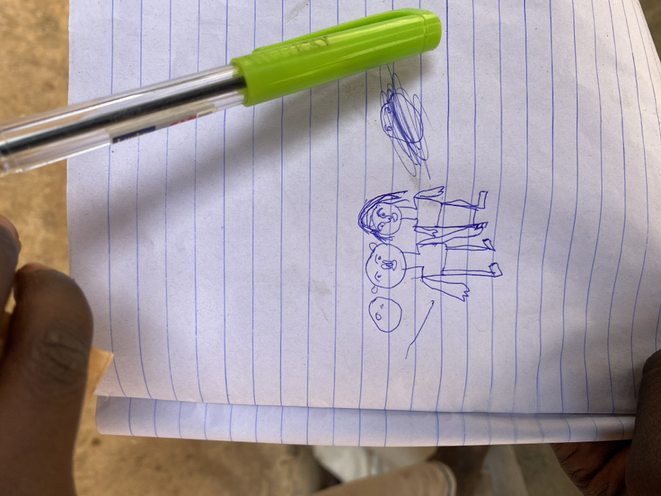 The image depicts a lined sheet of white paper, held at the bottom and top-left by fingers of a person with dark skin tone, in Kuru Dungus, Nigeria. On the paper, rudimentary drawings are rendered in blue ink. Two stick-figure-like humanoids, one appearing male with a simple face and the other female with hair, are centrally depicted. To their left, a smaller circular shape is drawn. To their right, a blue ink scribble is visible. A transparent ballpoint pen with a bright green cap and body rests diagonally across the upper right portion of the paper, partially obscuring a section of the blue lines and the scribble. The background elements are out of focus, suggesting an indoor or sheltered setting with light brown and beige hues.